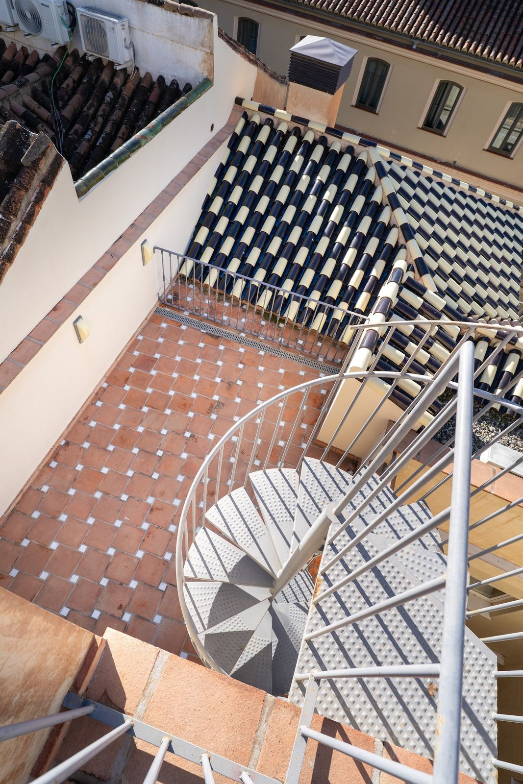 On the upper level, a second terrace is situated on the same floor as the third bedroom. From this level, an elegant spiral staircase leads to the rooftop terrace. From this elevated position, you enjoy open views towards Málaga Cathedral, partial views of the port and the sea, as well as panoramic views over the rooftops of the historic centre and the surrounding hills.