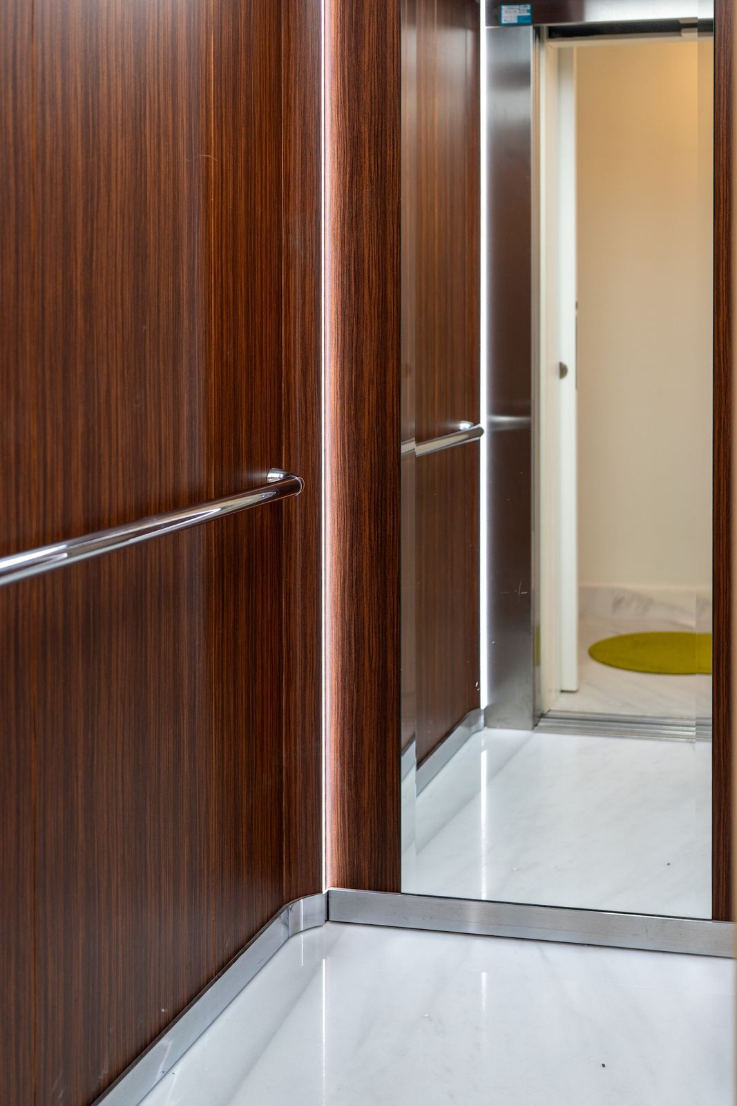 The property occupies the top floor of a rehabilitated building and benefits from private lift access directly into the apartment. For visitors, the lift reaches the third floor, followed by one additional flight of stairs leading to the entrance door of the penthouse.