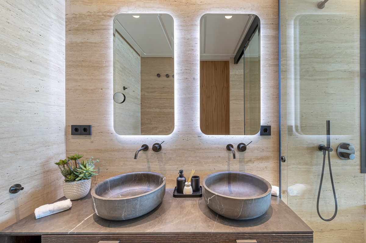 Spanning an impressive 104m² of interior space, the apartment features two generously proportioned bedrooms and two meticulously designed bathrooms. The fully fitted kitchen, equipped with high-end appliances, flows seamlessly into the open-plan dining and living areas, creating a perfect space for entertaining or relaxation. Premium finishes, including marble flooring, double glazing, and glass doors, enhance the sophisticated aesthetic, while the home automation system, central heating, and air conditioning ensure year-round comfort. Additional highlights include a utility room, storage room, and a private garage.
