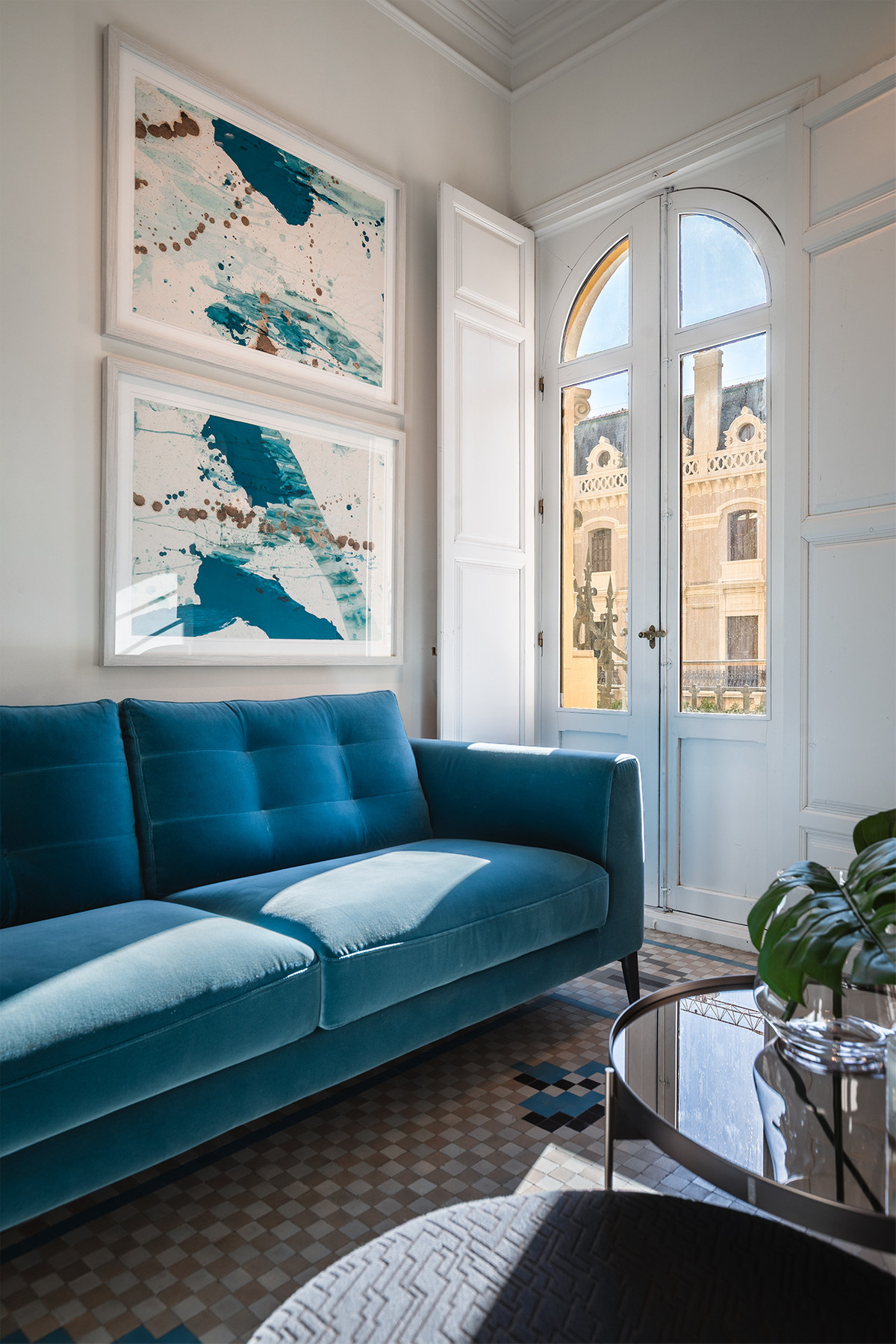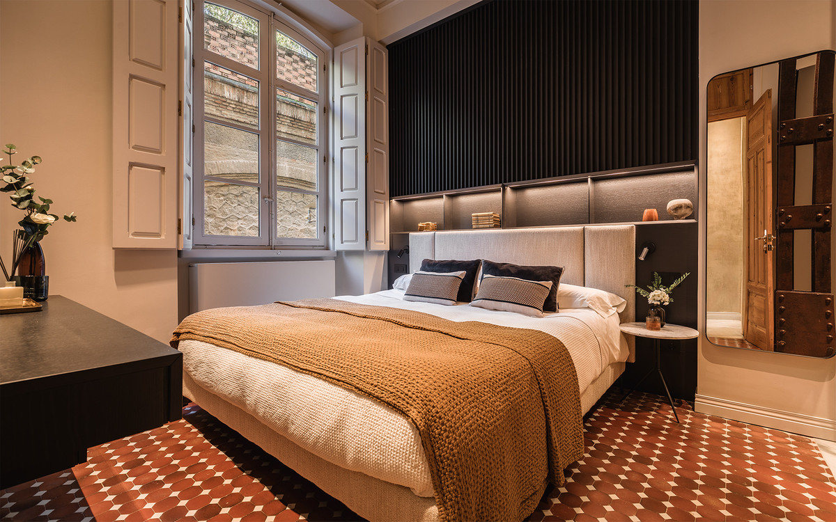 The materials and finishes reflect a careful combination of tradition and contemporary comfort. The walls feature artisanal lime stucco, microcement, and eco-friendly paint by Farrow & Ball. The original Nolla mosaic flooring, meticulously restored, is preserved throughout most of the property, adding character and aesthetic coherence. The doors and windows from 1922 have been recovered, maintaining the original woodwork and updating hardware and mechanisms to ensure functionality.