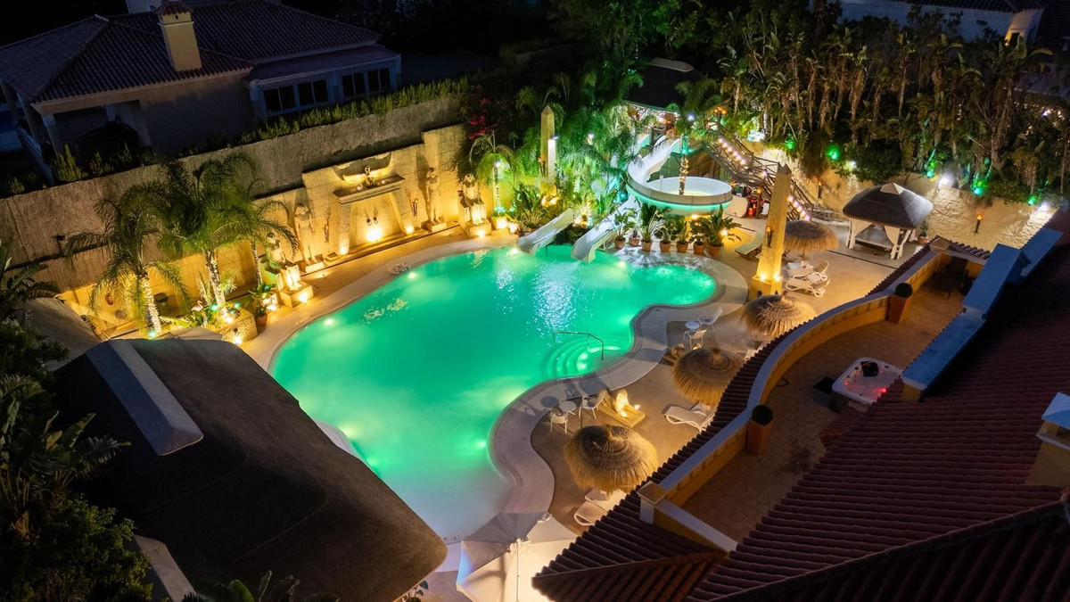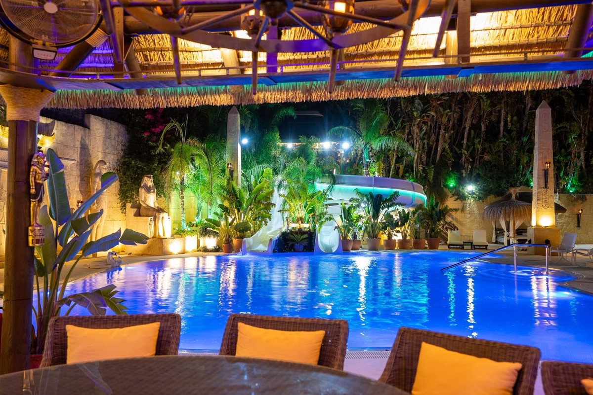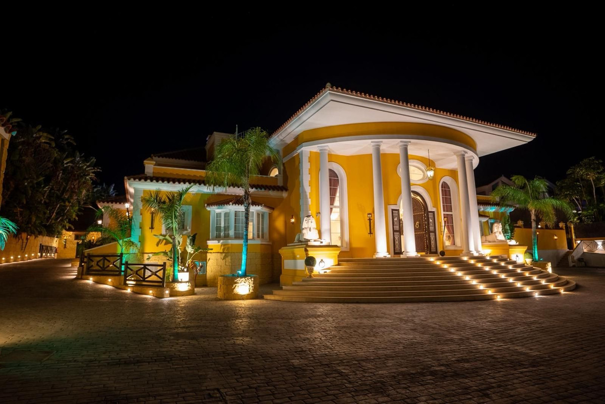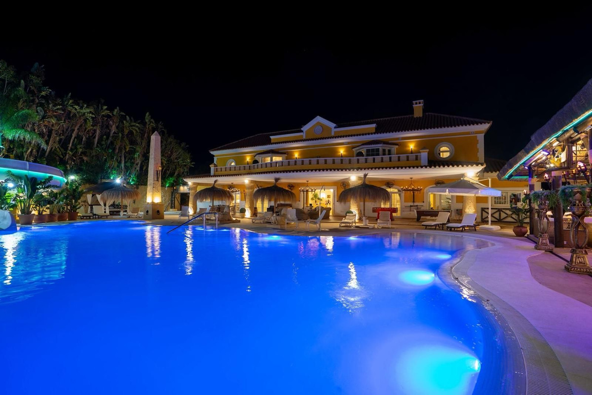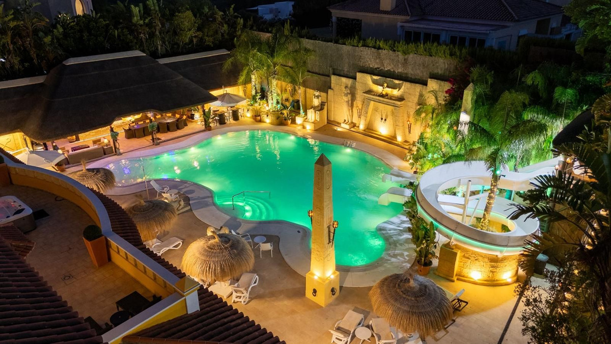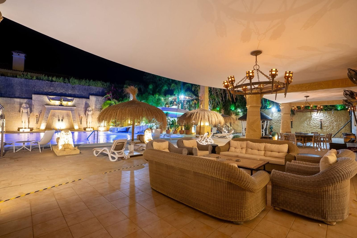 Located in Zone G of Sotogrande Alto, this large luxury villa was built by the current owner over a period of 10 years to a very high standard, using state-of-the-art materials and a wide selection of incredible crystal chandeliers. The large entrance hall features two curved marble staircases leading to the upper floor, where there are three bedrooms, one of which is the master suite, with Egyptian-themed décor, hand-painted walls, ornate moldings, and solid stone pillars. There is also a private living area overlooking the garden and pool. There is a dressing room and the main en-suite bathroom with a whirlpool tub and double walk-in shower. Two other spacious bedrooms, both en-suite, are located on this floor, connecting to the private terrace and from there, up the stairs to the private solarium. Inside the villa there is an elevator serving all 3 floors and on the ground floor there is the large living room, dining room, and doors to the covered terrace and pool area. There is also a service kitchen with pantry, utility room, and laundry/storage room. There is also a fully equipped cinema room with 8 leather seats. In the semi-basement is the entertainment suite, all decorated and hand-painted in an Egyptian theme, with matching decorations. There is a poker table, seating areas, a large cocktail bar, a modern gym with changing rooms and showers, and two further bedrooms with en-suite bathrooms, also in Egyptian style. In the center of the living room is a miniature theater modeled after London's West End theater, with two boxes and 37 seats. Luxuriously decorated in theatrical style, it comes with the complete set and props for a production of the musical Phantom of the Opera and offers a complete sound and lighting system, as well as the potential to show movies with the cinema system and stage for small private concerts. Work on the villa and grounds has not been completed, but this is a unique and personalized property, well worth viewing for the buyer looking for that special style home.