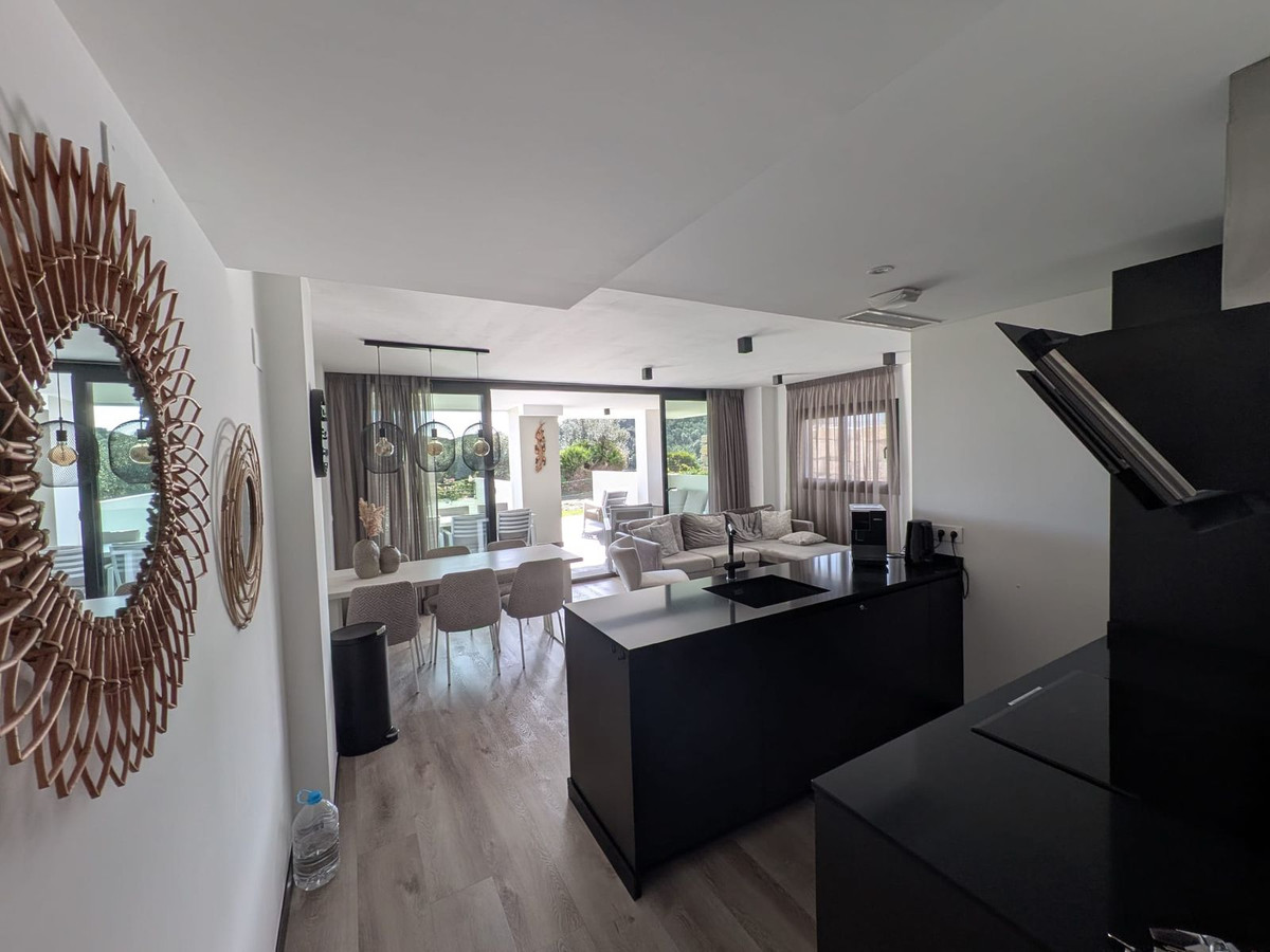Built in 2023 and presented in excellent condition, the apartment features three bedrooms and two bathrooms, with a bright and exceptionally spacious living area that flows directly onto expansive terraces. The southwest orientation ensures abundant natural light throughout the day, while panoramic views stretch across the Mediterranean Sea, the mountains, and the beautifully landscaped gardens and pool areas.