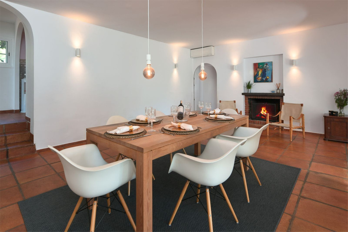 This beautiful hacienda-style villa located in a quiet residential area of Artola Alta and next to Cabopino. Situated only a short walking distance from the natural reserve, Artola Dunes & Beach, Cabopino- Beach & Habour with its restaurants and supermarkets. The villa consists of three bedrooms and two bathrooms, two living rooms and kitchen with a utility room. Its distribution is functional being in one level and ensure privacy due to the master- bedroom & bathroom are separated from the guest- bedrooms & bathroom by the living- and dining areas. The house is private and secluded by a surrounding wall. The property is entered from north by the street via a gate that leads to the patio which gives access to a double garage and a covered entrance to the house. The éntre leads to a fully fitted kitchen and a large dining room. The house opens up towards the garden and pool area via the living room which also gives access to a covered terrace. The the pool area is nestled by a mature and lush tropical garden. The garden boasts several fruit baring trees. The property also have a 20 m2 roof top terrace where you can watch the sea and the sun setting over Marbella bay and La Concha mountain.