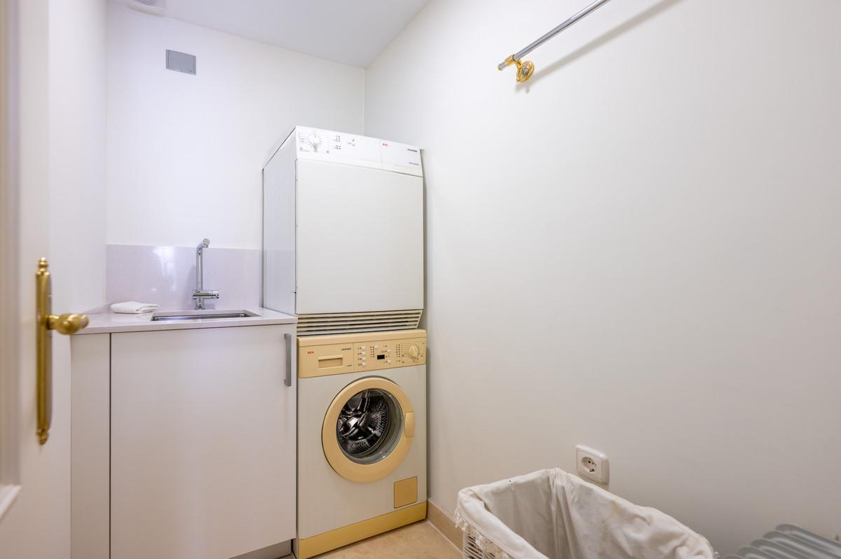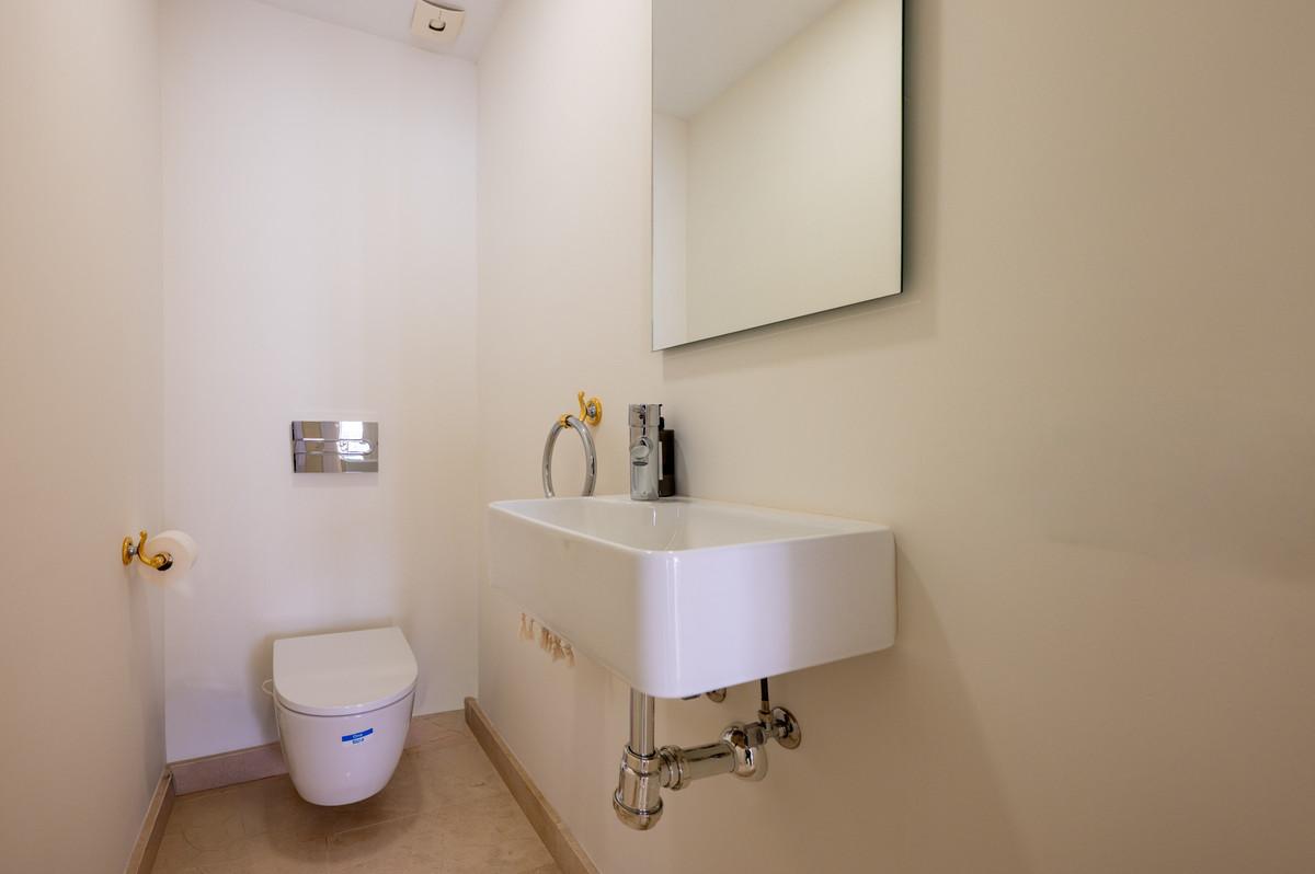 Upstairs, the master suite offers its own generous bathroom and steps out onto a fully private uncovered terrace. The elevated position here noticeably amplifies the already beautiful panoramic views. From here, a staircase leads to the crown of the home: a 30 m² rooftop solarium with far-reaching panoramic views over the Nueva Andalucía golf valley and mountains, a space made for sundowners and long Mediterranean evenings.