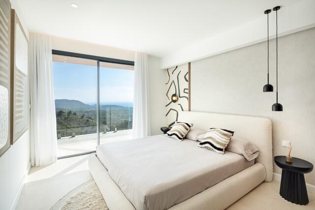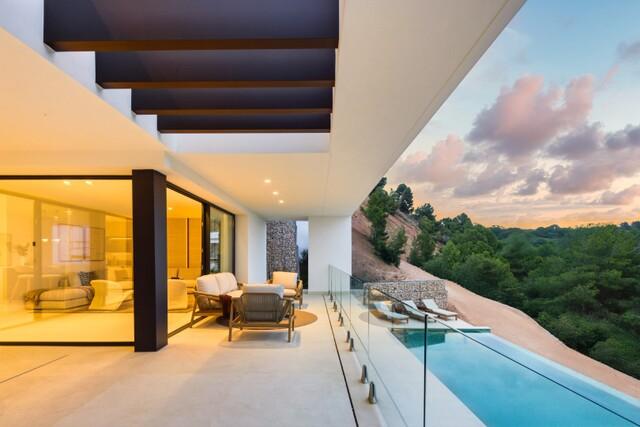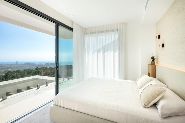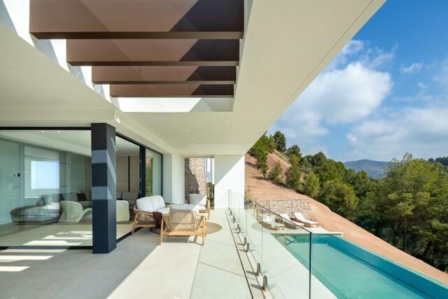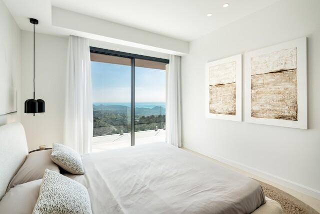 Large floor-to-ceiling windows allow natural light to flow throughout the interiors while framing panoramic views of the Mediterranean coastline and surrounding hills.