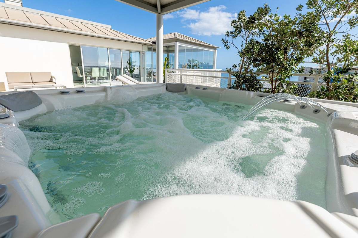 From a covered entrance, beside the elevator, with views of the Sierra Nevada mountains and the Mediterranean sea, you enter this opulent penthouse through a bespoke steel and glass covered vestibule between 2 security doors leading to an internal entrance with a powder room.