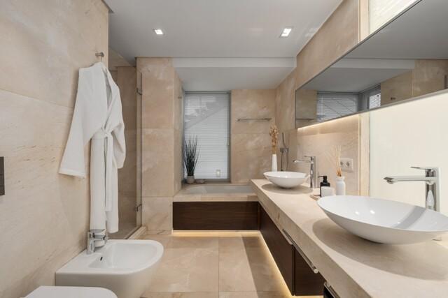 The top floor is reserved exclusively for the impressive master suite, featuring a walk-in wardrobe, luxurious bathroom and a private sea-facing terrace. This level offers complete privacy and panoramic views across the Mediterranean.