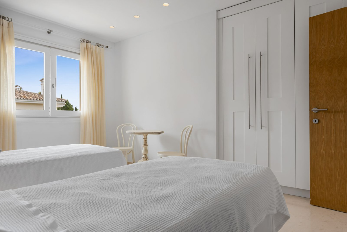 The upper level boasts two large bedrooms with en-suite bathrooms, both leading onto a spacious terrace overlooking the gardens and pool. Additionally, there are two more bedrooms sharing a bathroom, along with a separate informal lounge/TV room.
