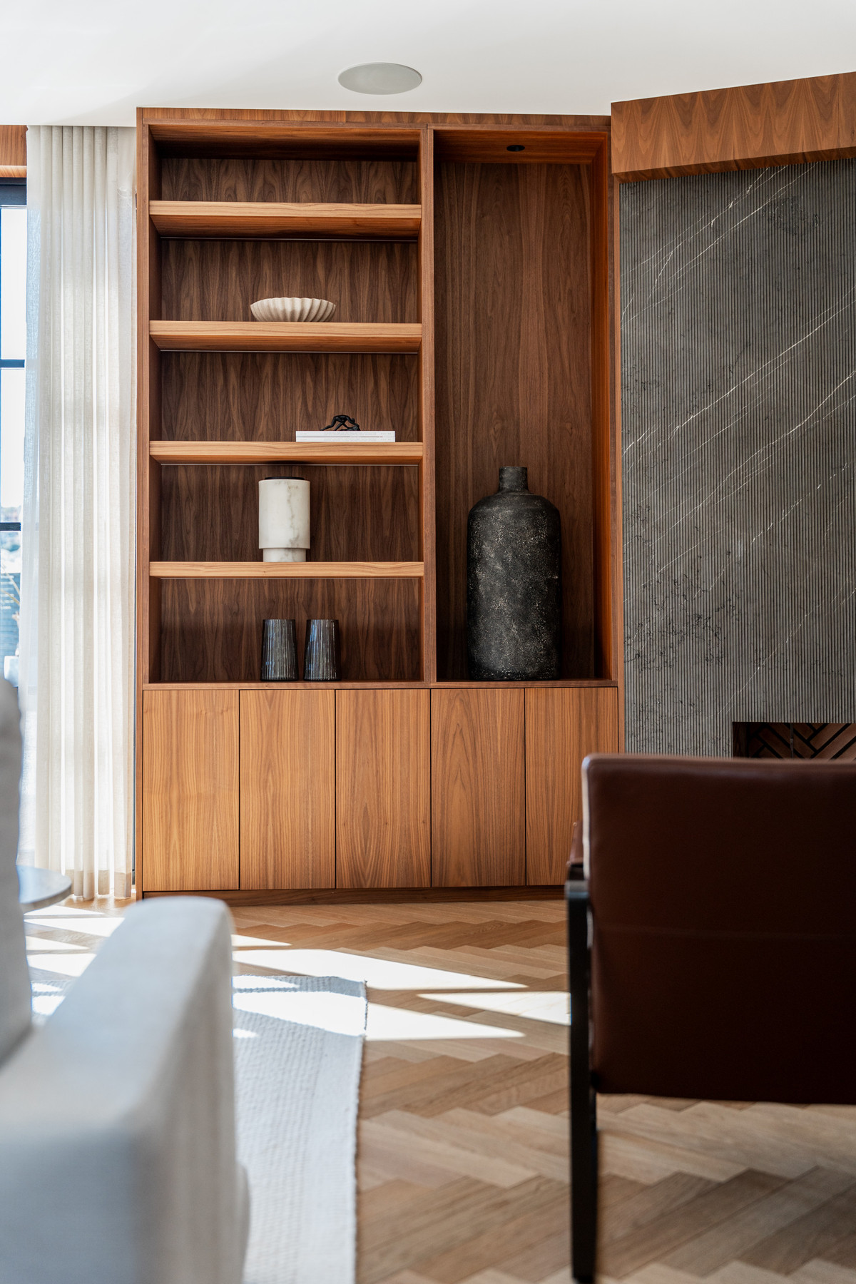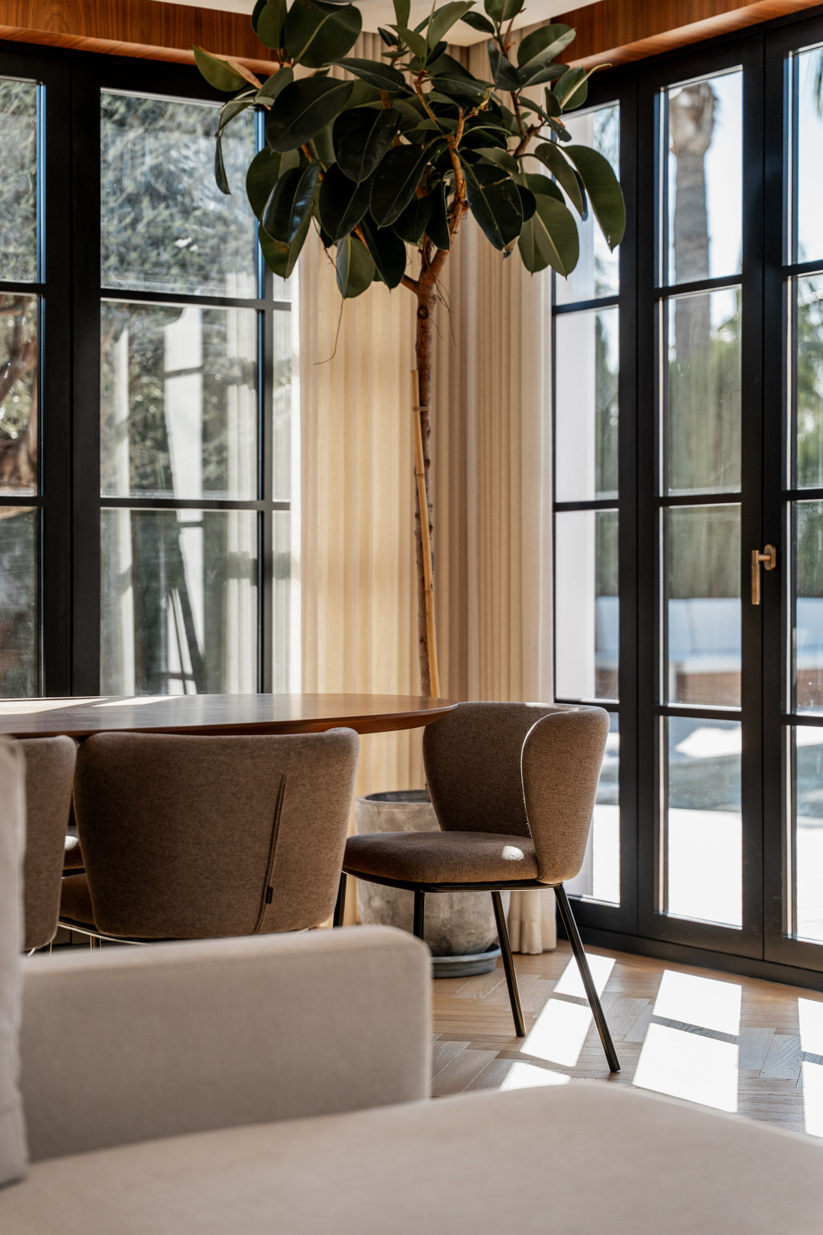 This is not your average Golf Valley villa. It has been redesigned with a clear architectural direction, where proportions, materials and flow have been carefully selected. From the entrance, the detailing is evident: herringbone oak flooring, bespoke walnut joinery, fluted cabinetry and dark-veined marble, all brought together with consistency rather than contrast for effect.