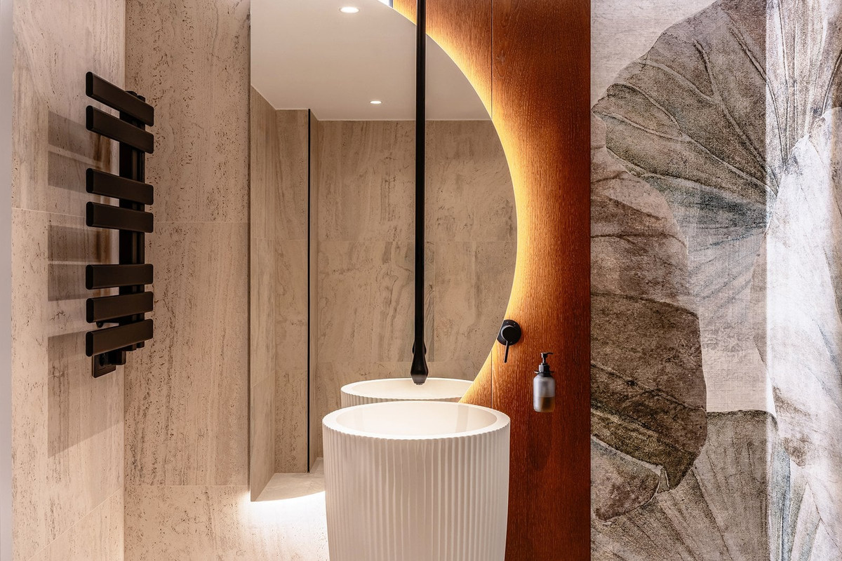 At the heart of the house is a thoughtfully designed living area, where natural light and selected materials create an elegant and relaxing atmosphere. The custom-designed kitchen, equipped with Gaggenau appliances, seamlessly integrates with the dining and living areas, ideal for both daily living and entertaining guests.