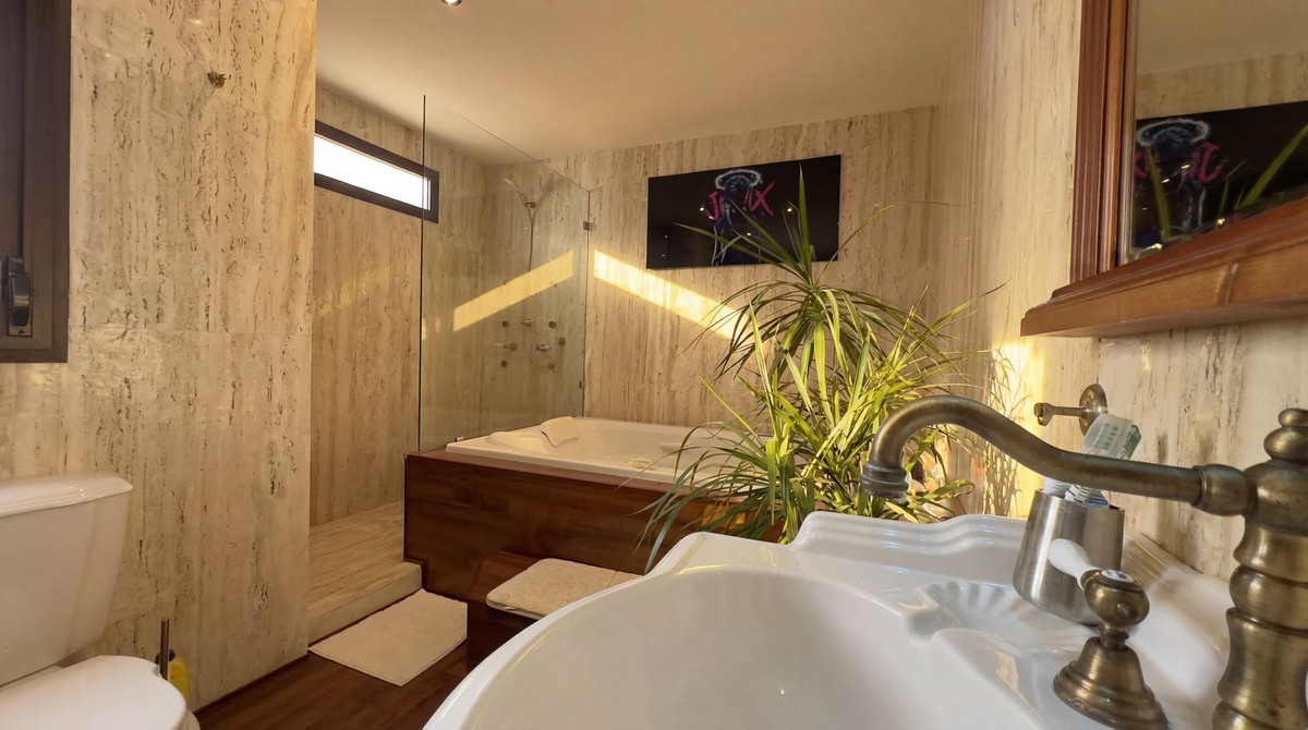 The bathroom offers a sense of luxury and relaxation, featuring a generous jacuzzi bath and a modern walk-in shower, finished with natural stone-style walls—an ideal space to unwind.