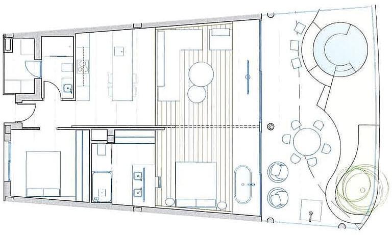 Inside, the apartment stands out for its contemporary loft-style design, emphasizing space, light, and flexibility. The open-plan kitchen is fully equipped with high-quality appliances and seamlessly connects to the living area, creating a bright and sociable atmosphere. The main bedroom features an open-plan bathroom with shower, while the toilet is separate for added comfort. A sliding wall allows the main bedroom to be opened up to the living room, offering a unique sense of space and adaptability. Large windows lead to an expansive 49 m² terrace with beautiful views over the valley and towards the sea, extending the living area outdoors and filling the interior with natural light. The terrace also features a private jacuzzi, creating an ideal space to relax while enjoying the views. The apartment also includes two parking spaces and a storage room, adding practicality to its modern design.