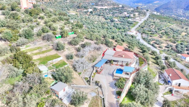 Outside, the property sits on an extensive 3,000 m² plot, offering ample possibilities for enjoyment and privacy. It includes a vegetable garden area, a large terrace with open views of the natural surroundings, a barbecue area, a garden, and a private swimming pool.