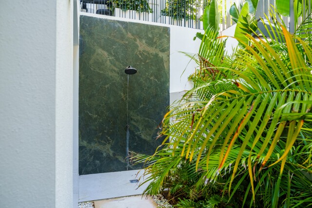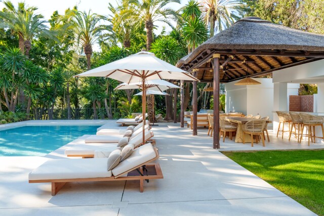 The outdoor areas are designed for relaxed Mediterranean living, featuring manicured tropical gardens, a private swimming pool, and a gazebo with Argentinian barbecue, bar, dining area, lounge space, and outdoor kitchen. These spaces offer seamless indoor-outdoor flow and are ideal for entertaining throughout the year.