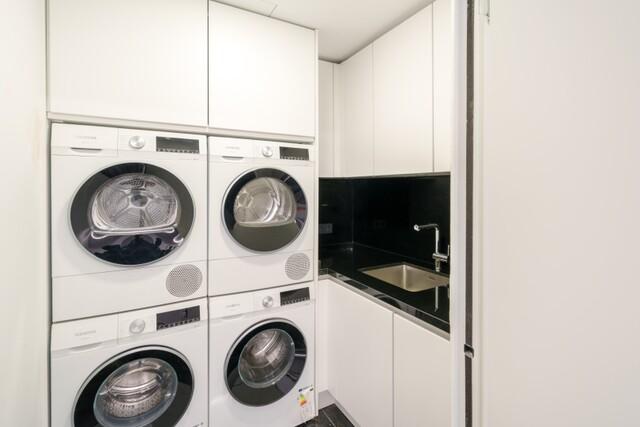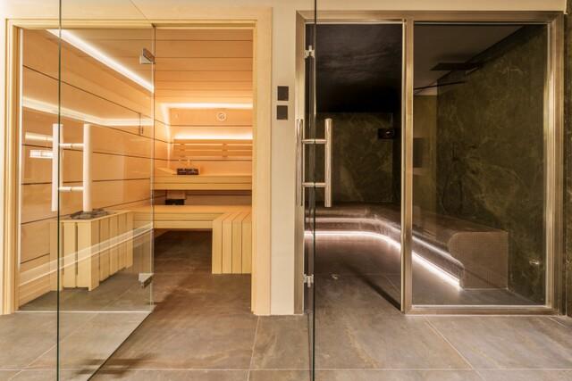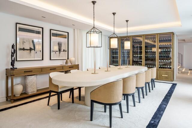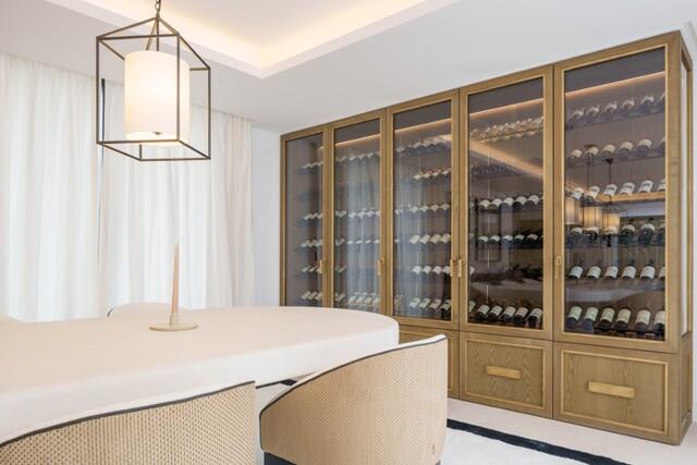 The lower level exceeds 300 m² with impressive three-metre ceiling heights, creating an exceptional space dedicated to wellness and leisure. This level features a private garage, rotating car platform, luxurious spa with sauna, hammam, cold plunge and shower, as well as a fully equipped indoor gym and a state-of-the-art home cinema. Additional entertainment areas and storage rooms complete this versatile floor.