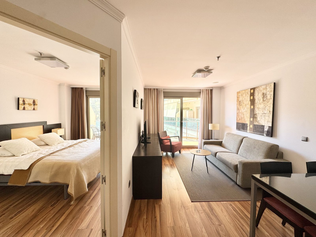 From the living room you access the pleasant south/west-facing balcony, where you can enjoy sunshine throughout most of the day, along with views over the swimming pool area and partial sea views.