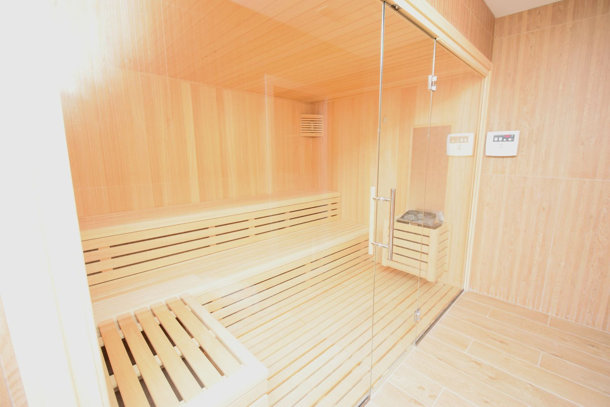 Coworking space. Equipped gym with sauna and shower area.