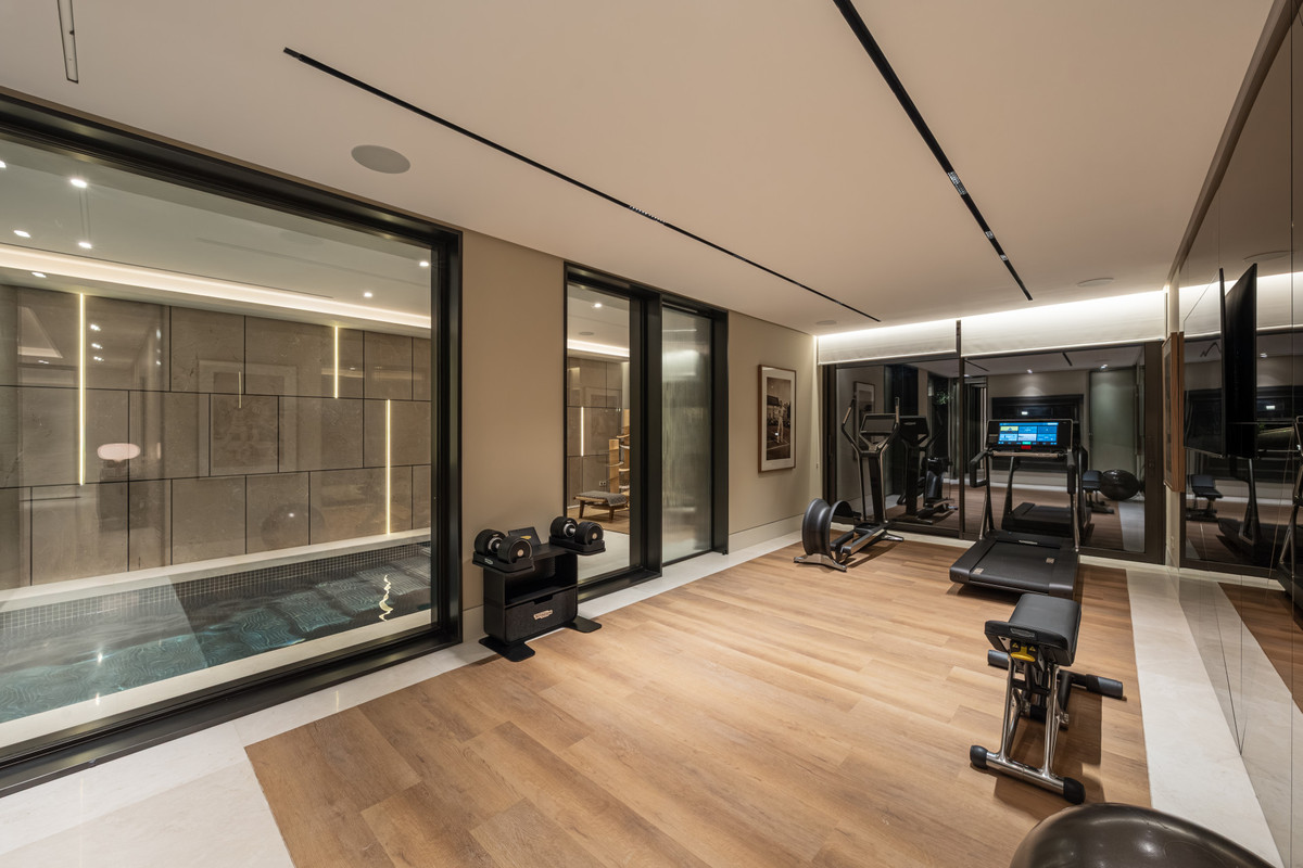 This remarkable property also includes an exclusive bar and entertainment room, a fully equipped gym, a Turkish bath, and an indoor pool, creating a private wellness and leisure sanctuary. Set on a generous plot, the villa offers extensive outdoor areas designed to enjoy the Mediterranean lifestyle, including multiple seating areas, a private swimming pool, and breathtaking sea views. The impressive solarium features an outdoor kitchenette and additional space for relaxation and entertainment.
