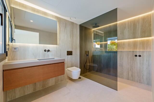 Each of the five bedrooms serves as a private retreat, offering peaceful garden or sea views and direct outdoor access. The bathrooms are designed with a spa-like feel, featuring elegant fittings, warm textures, walk-in showers, and a sculptural freestanding bathtub that adds a touch of modern sophistication.