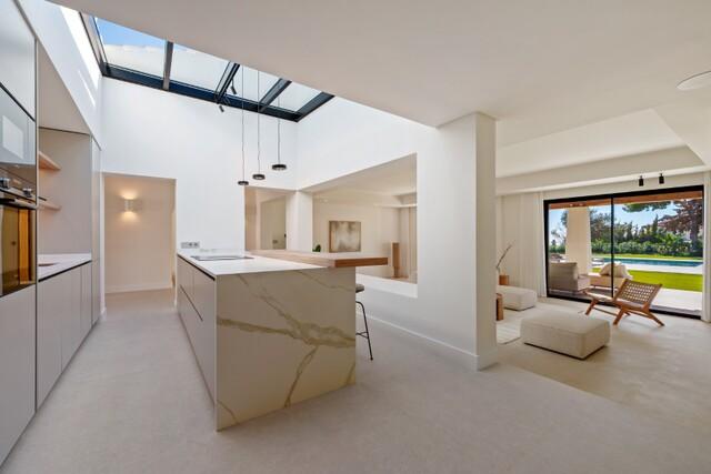 The villa’s interior is defined by a sophisticated minimalist design, where clean lines and carefully selected materials create a calm and luxurious atmosphere. Large floor-to-ceiling windows and skylights flood the home with natural light, enhancing the sense of openness throughout.
