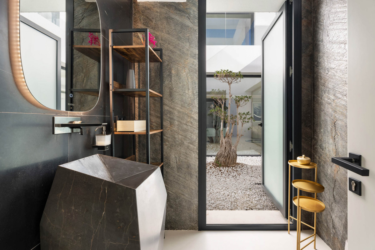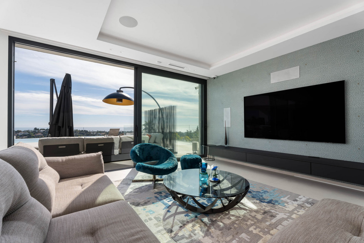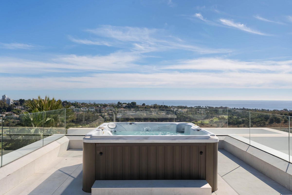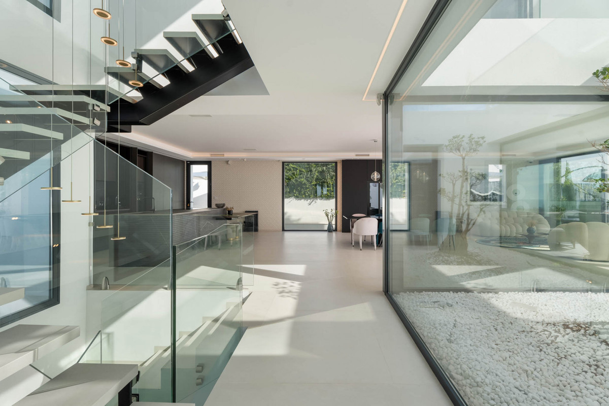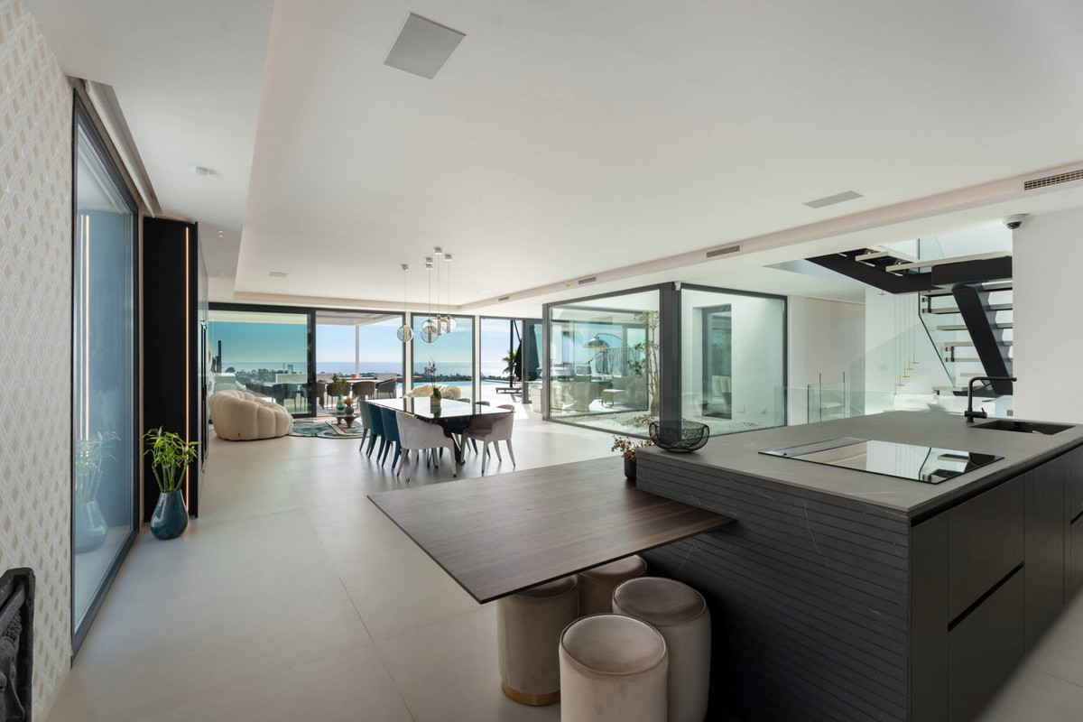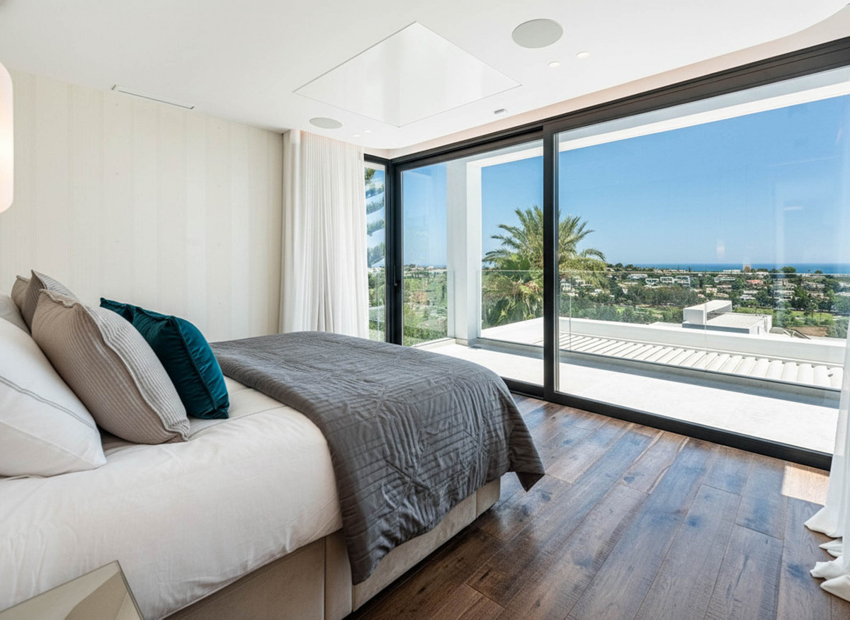 This designer villa in Paraiso Alto is presented as a contemporary residence created for those seeking privacy, ample space and a direct connection with the surroundings. Its elevated position allows views of El Paraíso Golf, the Mediterranean, Gibraltar, the African coastline and La Concha Mountain from various rooms and outdoor areas, creating a distinctive visual setting.