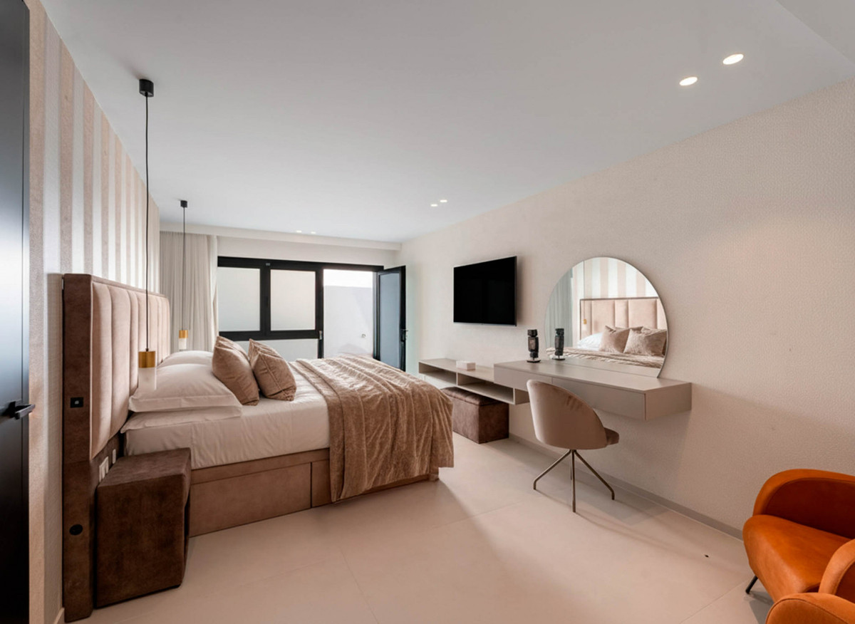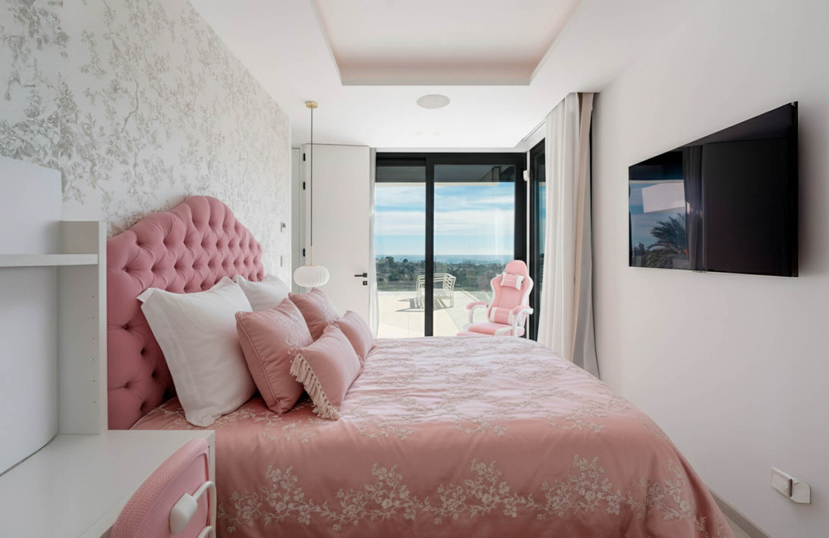 The villa offers six bedrooms, all with en-suite bathrooms designed for comfort and privacy. The primary suite enjoys sea views and access to a private terrace. The upper level includes a solarium with a jacuzzi and panoramic views stretching from the golf course to Africa, providing a dedicated space to take in the surroundings from the highest point of the property.