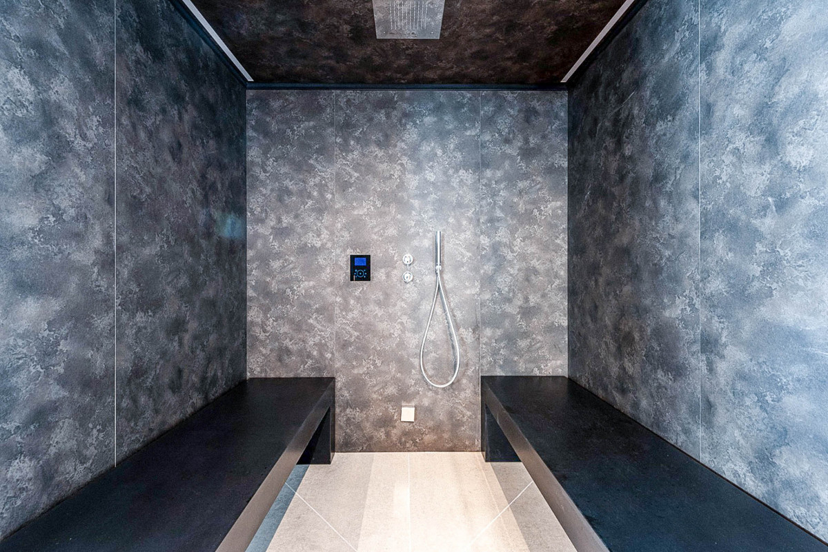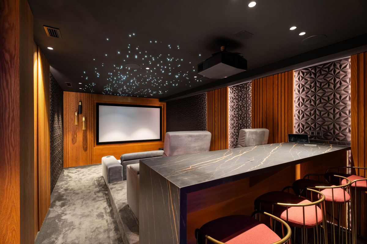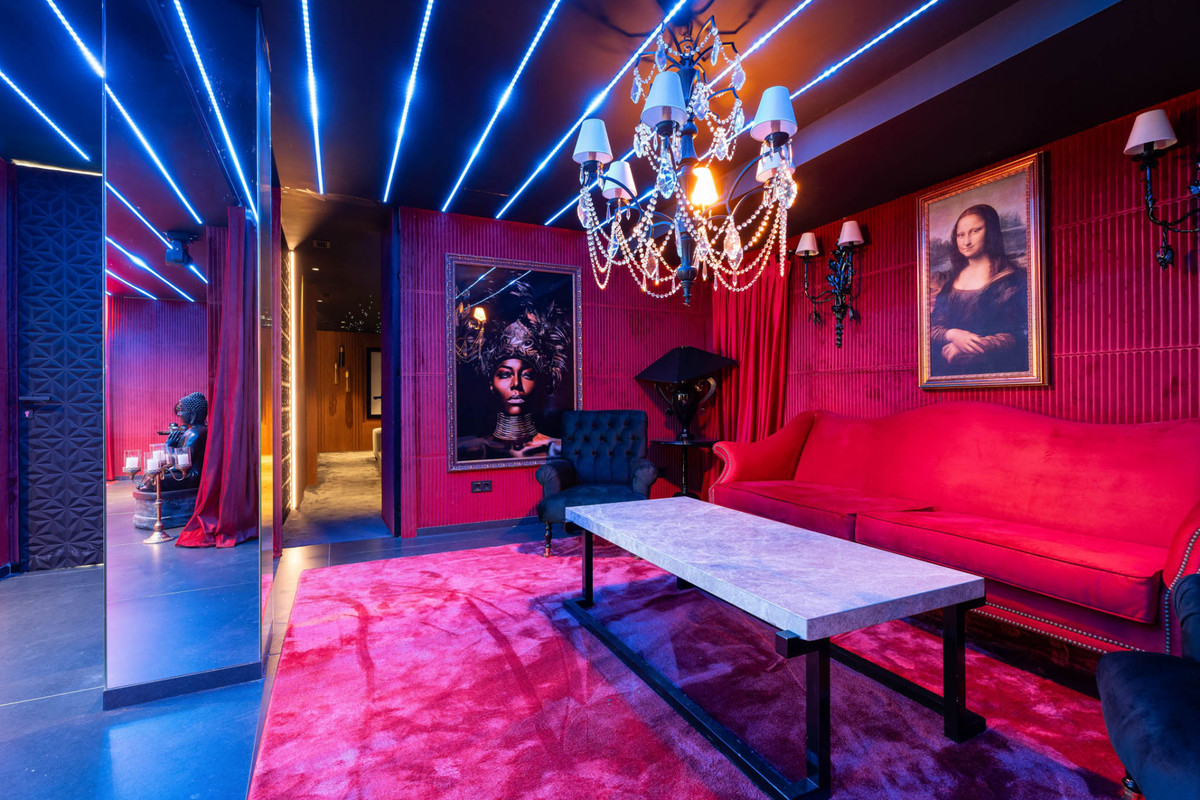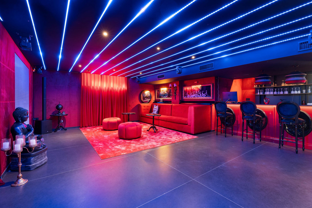 The lower level houses the wellness and entertainment areas, including a cinema room, gym, sauna and an independent space designed for gatherings. The property also features a large garage with turning platforms to facilitate easy manoeuvring.