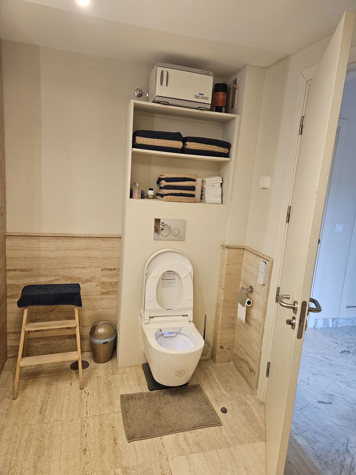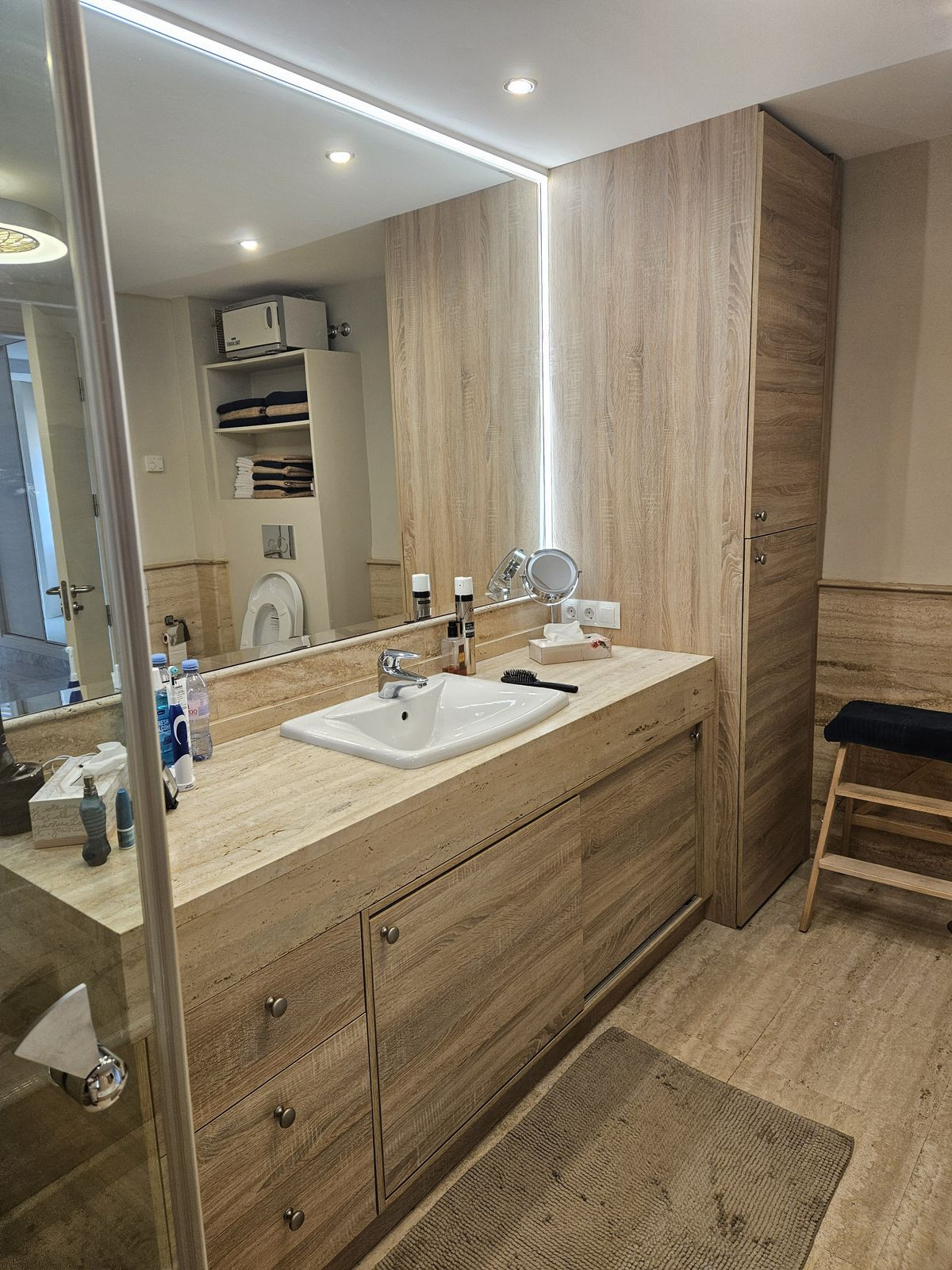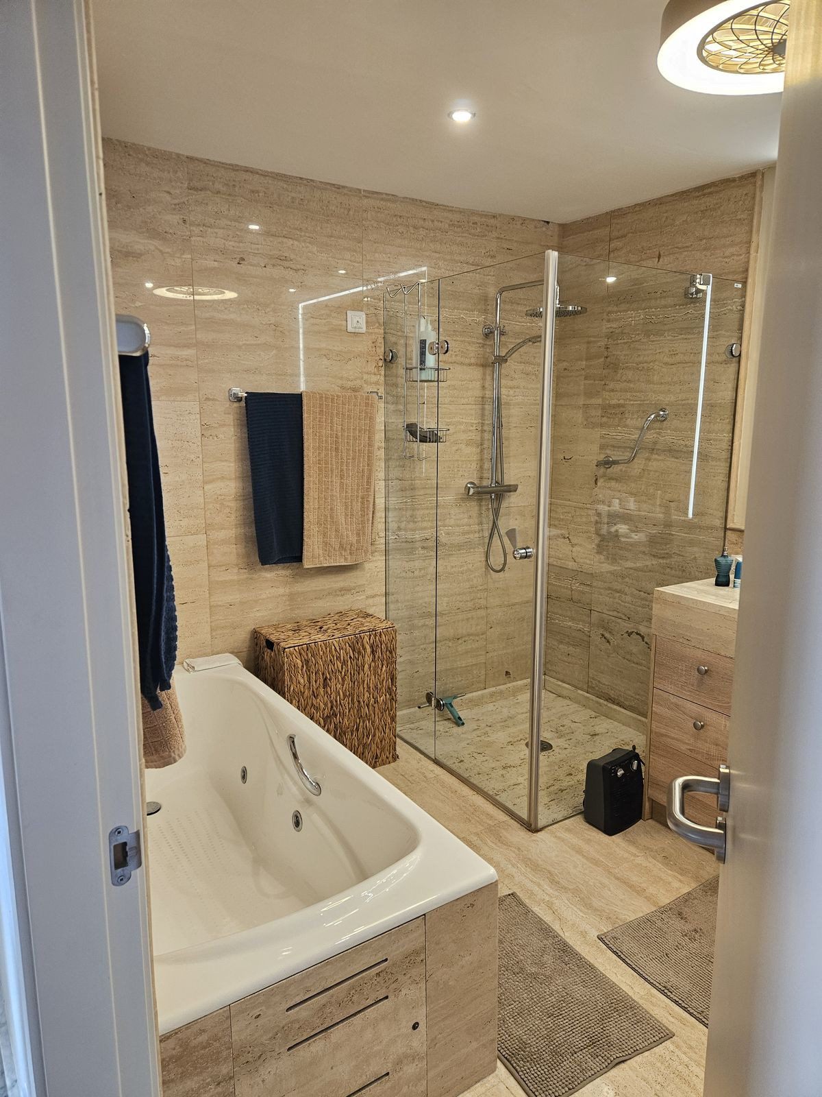 The bright and spacious living room is divided into a cosy sitting area and a separate dining area. Thanks to the modern glass wall that can be fully opened, indoor and outdoor space flow seamlessly into one another. The large terrace is an absolute asset, equipped with infrared heating, awnings and another fully opening glass wall - perfect for any season. In clear weather, you also enjoy breathtaking views all the way to the Malaga coast.