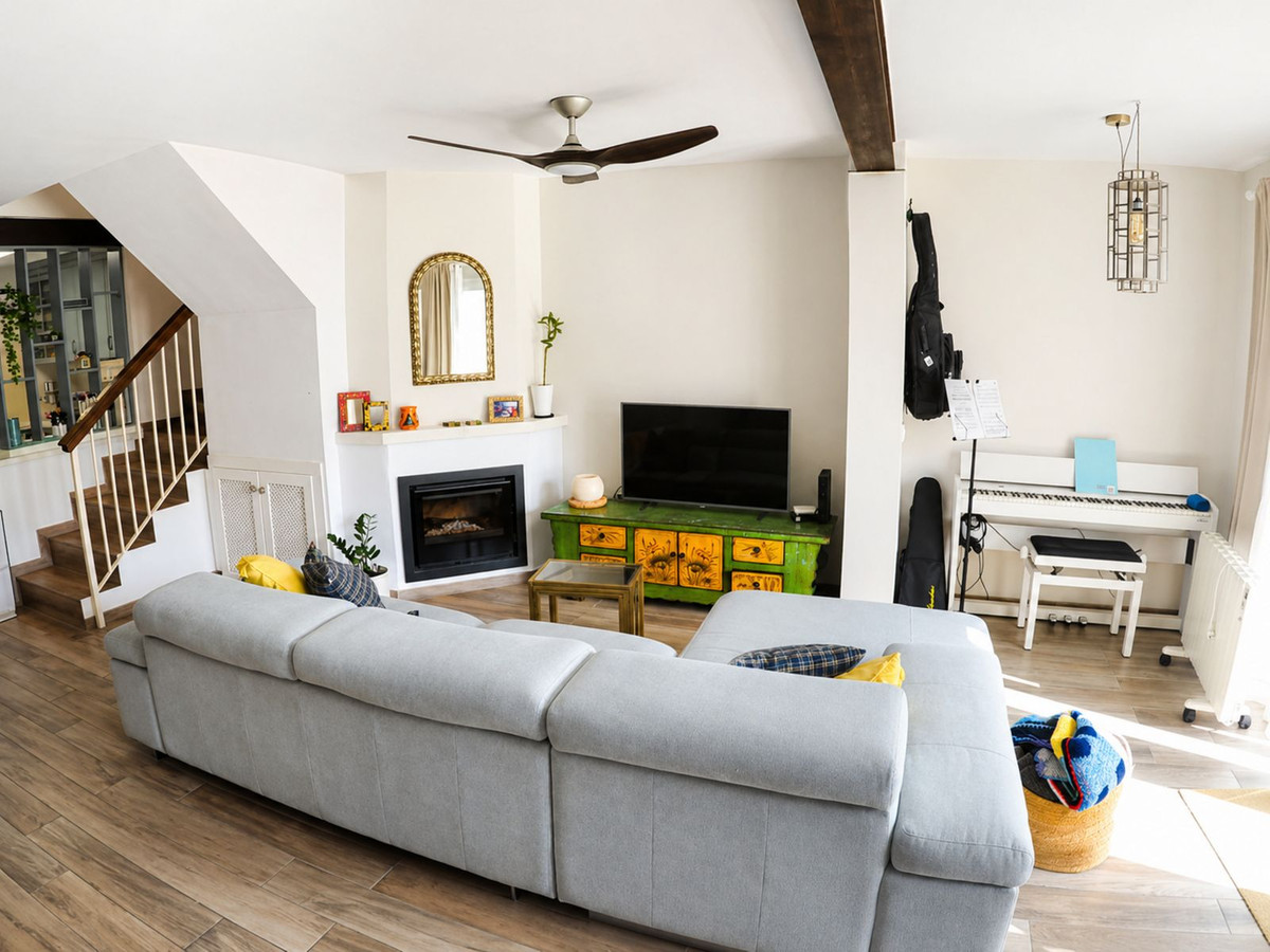 On the ground floor is a spacious open-plan kitchen, equipped with top-of-the-range appliances and a gas hob. On this level there is also a guest bathroom and a bright living room with a fireplace, a cosy space that opens directly onto a private garden of approximately 40 m², with pleasant views of the mountains and the natural surroundings.